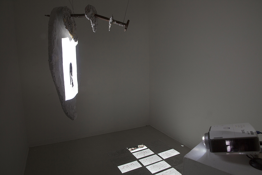 My own way of meditation is the structure of my works. One work is an installation of two videos. First, I videotape myself writing “guilty thoughts” with my finger on pieces of concrete on the floor, and then I installed the video by projecting it onto a sculpture. The performance becomes a sort of ritual action. For the sculpture, I hung the pieces of concrete from the ceiling using a giant nail. By putting the concrete tables of sins onto the nail, it creates the meaning that my sins have been transferred and are already forgiven. Writing sins onto the lowly concrete represents guilt and guilt is something that we carry with us in our lives.